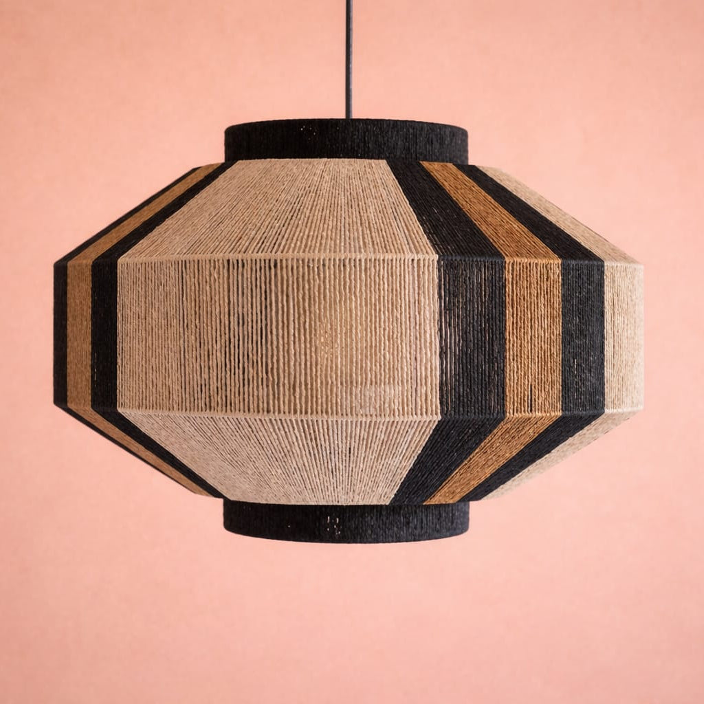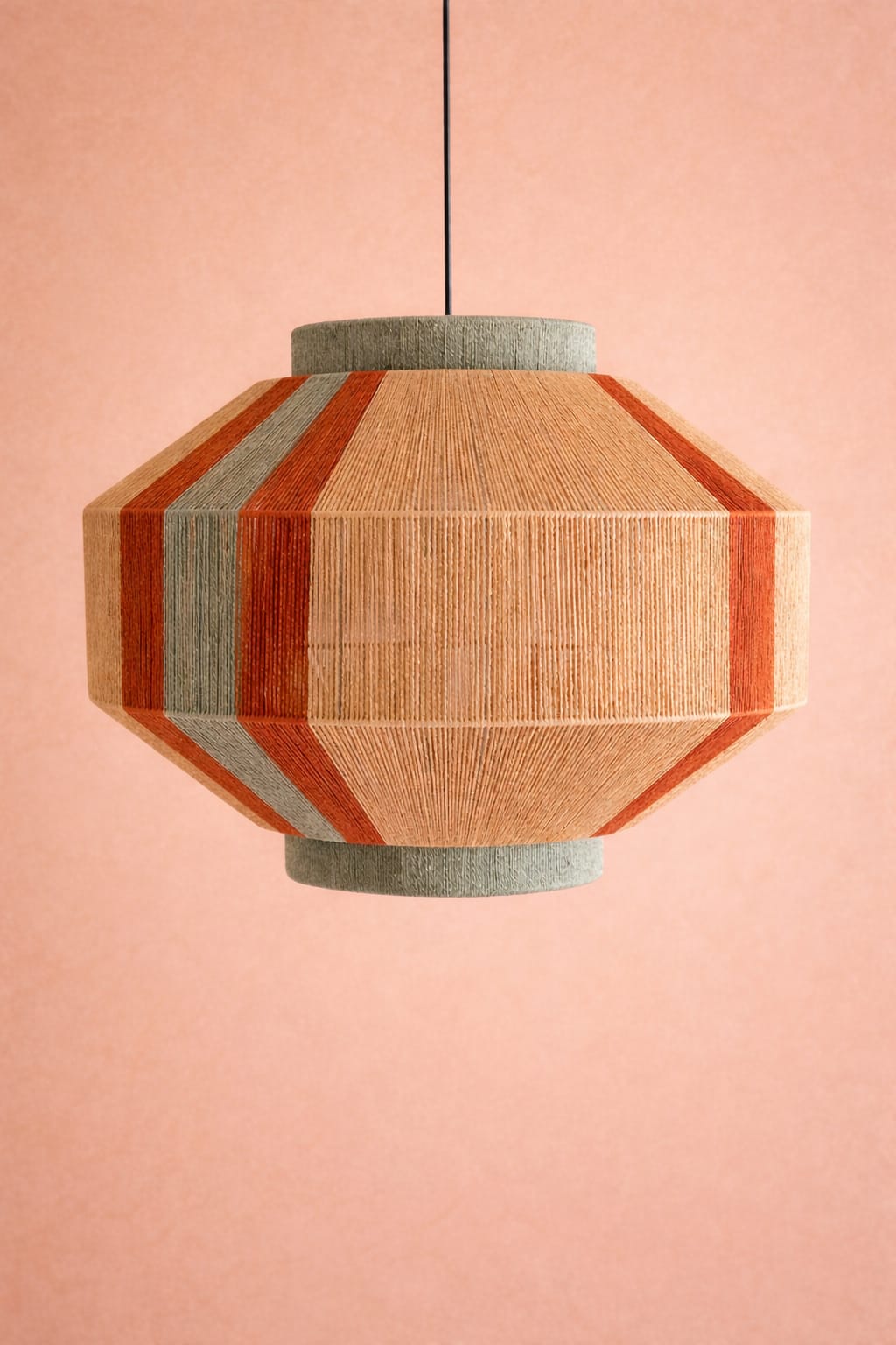 El tejido genera una luz cálida y tamizada, ideal para crear atmósferas acogedoras y envolventes. Las variaciones cromáticas integradas en el diseño aportan profundidad visual y un ritmo sutil, haciendo de esta lámpara una pieza decorativa que funciona tanto encendida como apagada.