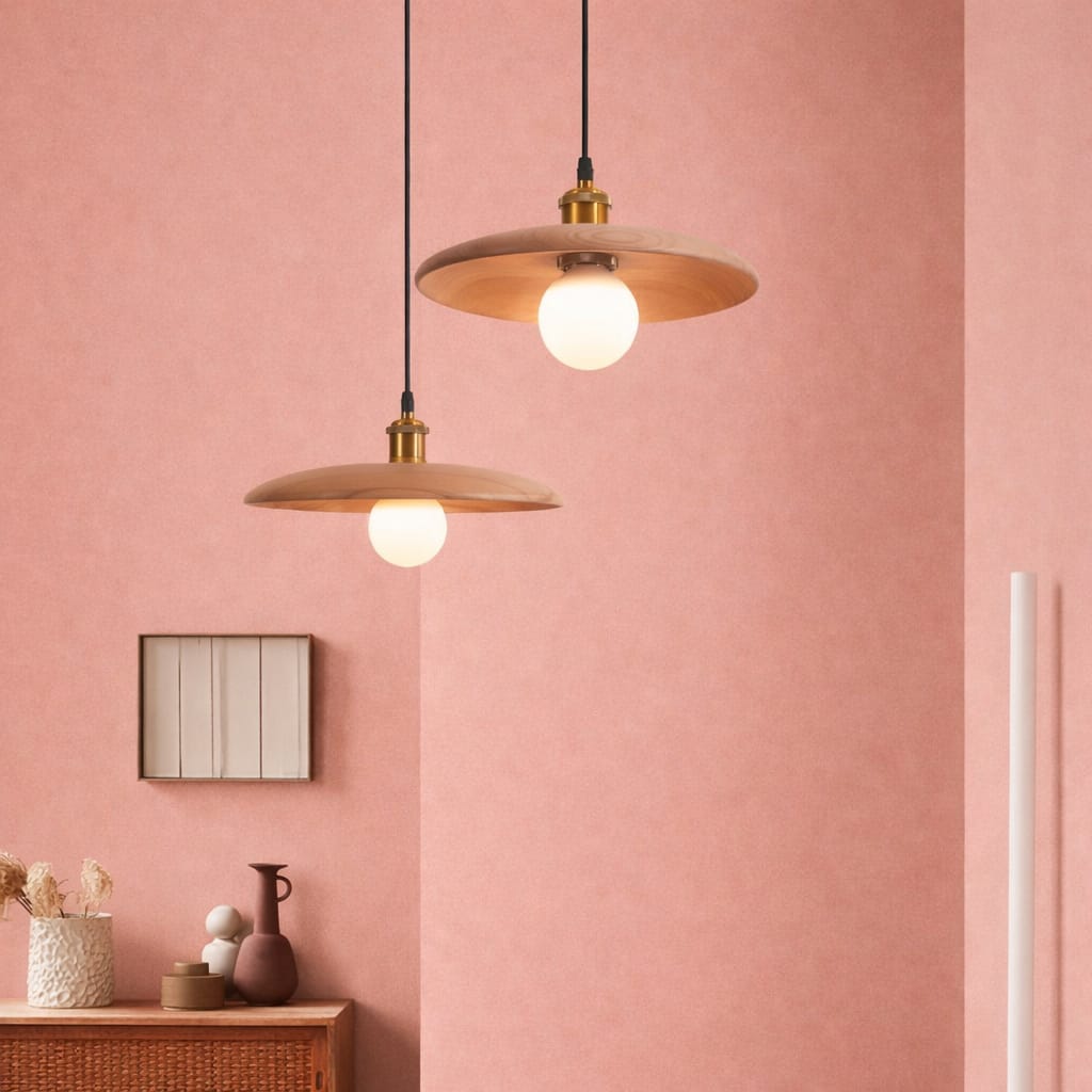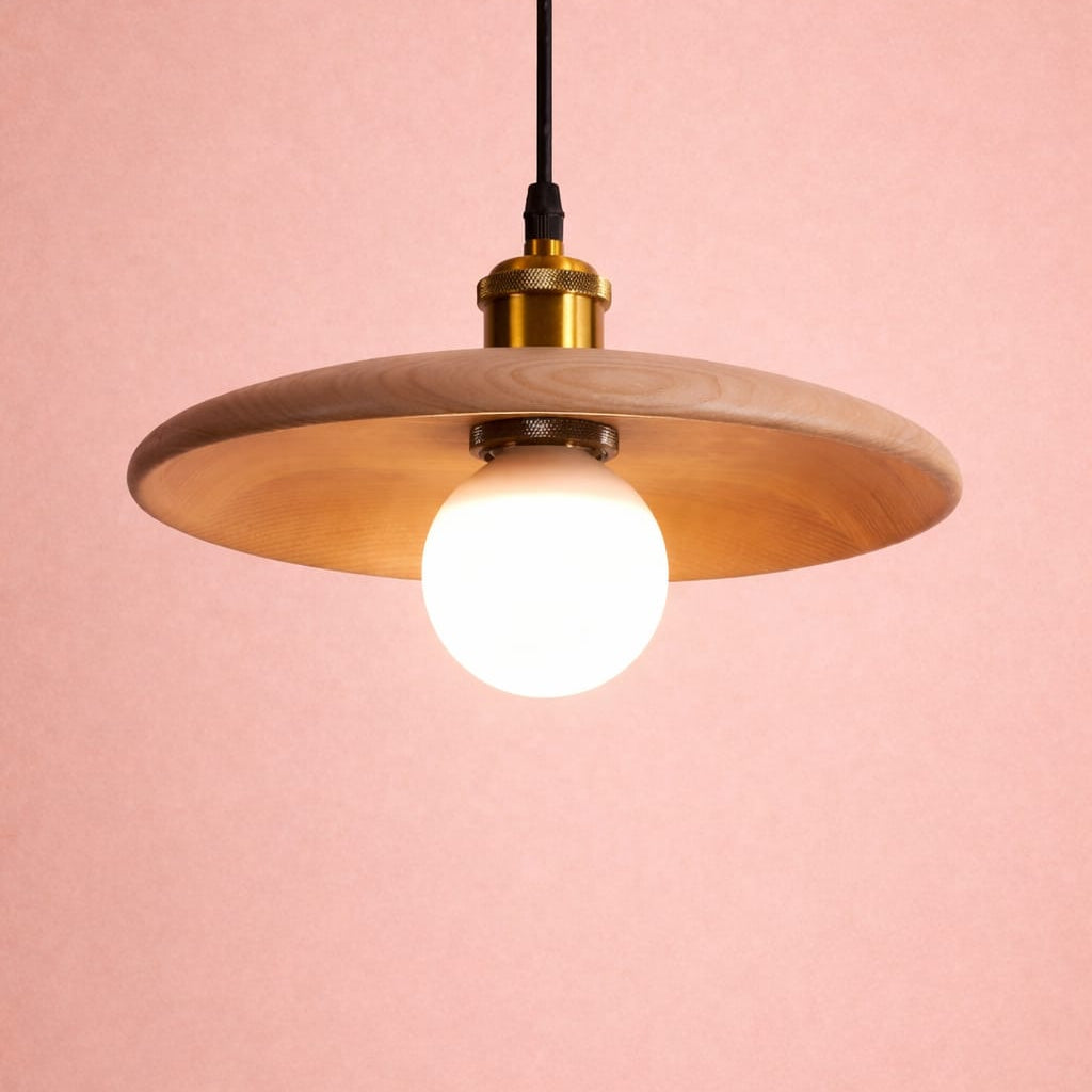 Lámpara colgante de diseño contemporáneo compuesta por un disco en madera natural y un bombillo opal suspendido en su parte inferior, creando una pieza equilibrada que combina geometría y calidez.